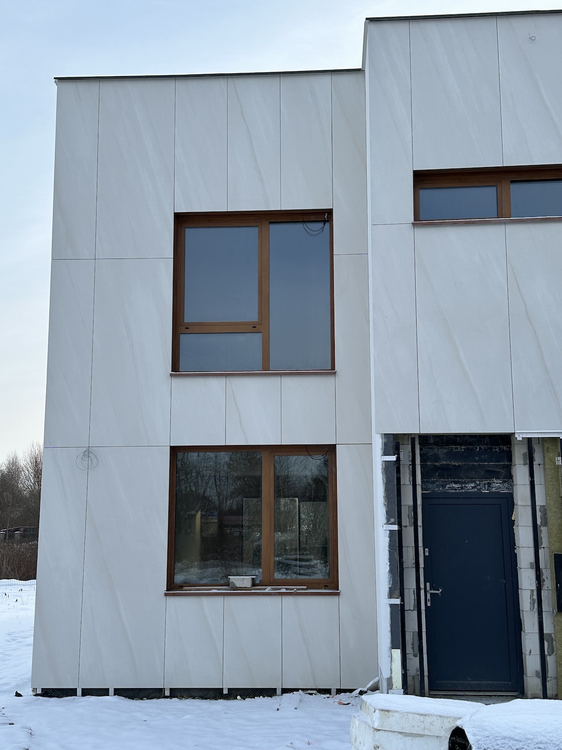 Elewacja wentylowana eliminuje ten problem strukturalnie. Okładziny zewnętrzne – spieki kwarcowe, HPL, ceramika czy płyty włókno-cementowe – mają nasiąkliwość bliską zera. Nie wchłaniają wody, więc nie ma czego zamrażać. Szczelina wentylacyjna o szerokości 2,5–3 cm odprowadza wilgoć kondensacyjną z warstwy izolacji, zanim zdąży wniknąć głębiej. Materiały zachowują parametry w pełnym zakresie temperatur eksploatacyjnych od -30°C do +70°C.