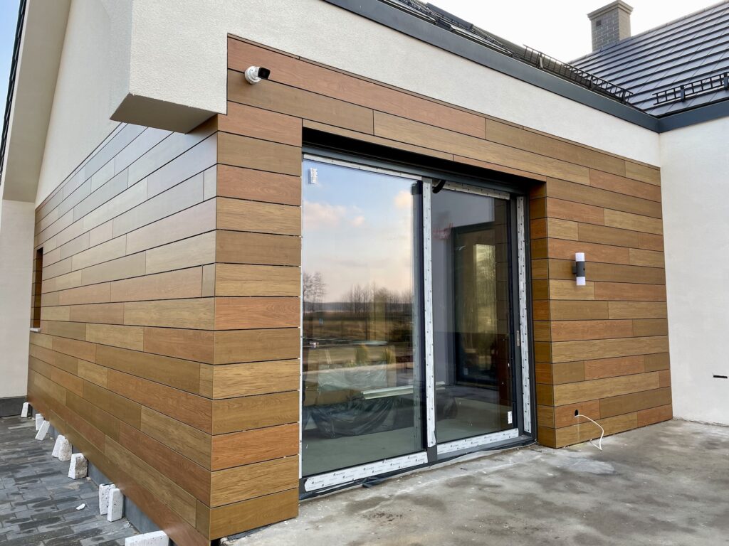 Trwałość: wieloletnia bez degradacji. Odporność UV – brak blaknięcia kolorów. Odporność na mróz – cykle zamarzania nie wpływają na strukturę. Odporność na wilgoć – płyty są hydrofobowe (odpychają wodę), nie absorbują wilgoci.